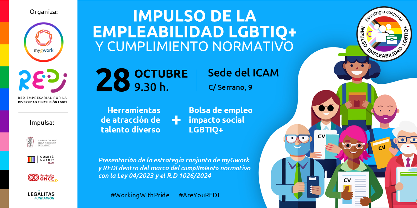El próximo 28 de octubre en la sede del ICAM, REDI y myGwork presentarán su nueva estrategia “Impulso empleabilidad LGBTIQ+” y el cumplimiento normativo, un